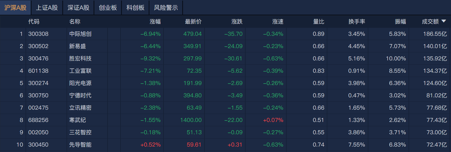 南财金融终端显示,个股方面,中际旭创半日成交额超186亿元居首,新易盛、胜宏科技、工业富联成交额靠前。