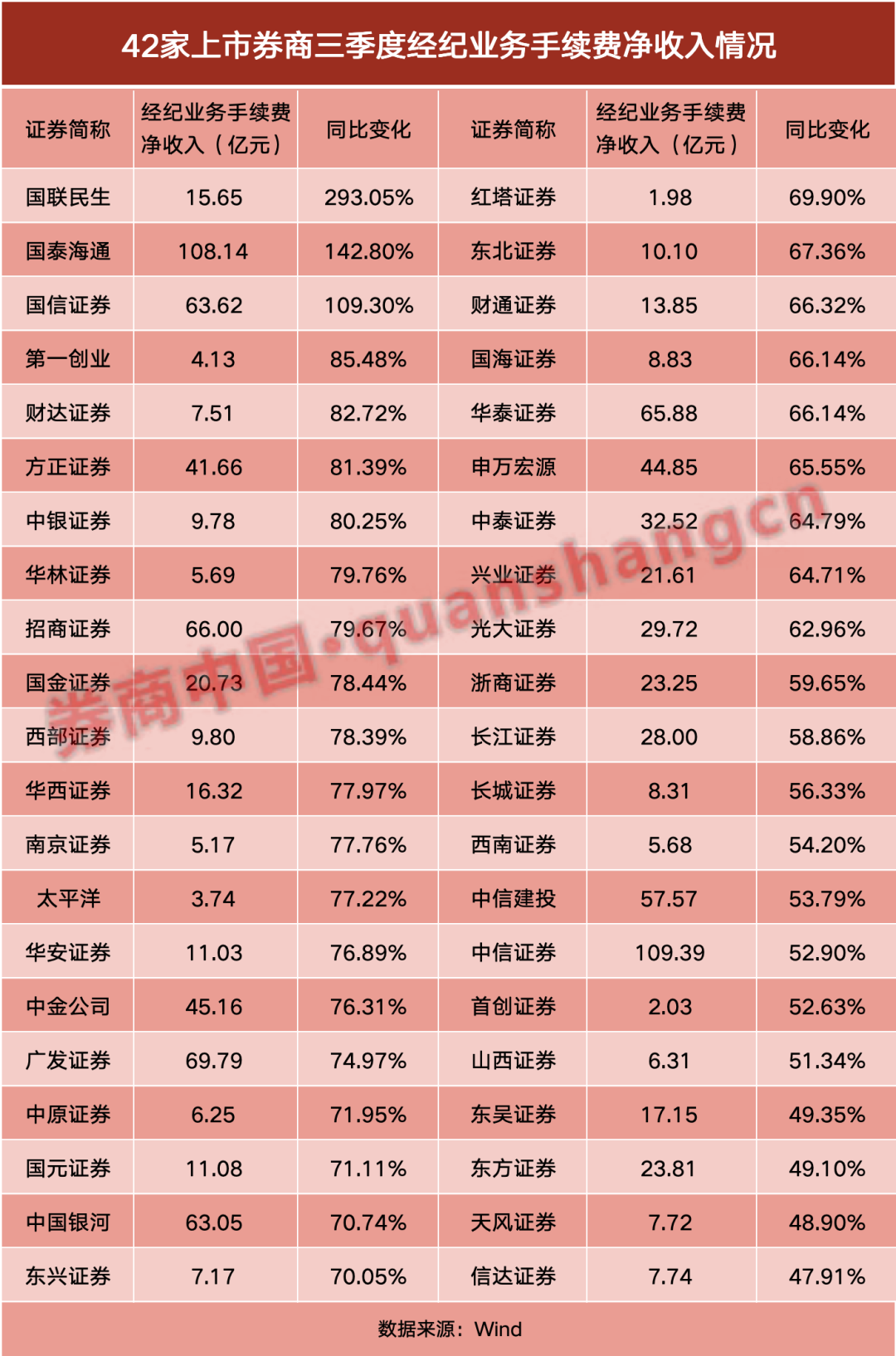 这一指标增幅超过100%的券商分别是国联民生(293.05%)、国泰海通(142.80%)、国信证券(109.30%)。第一创业、财达证券、方正证券、中银证券等中小券商经纪业务增长也呈现“加速度”。
