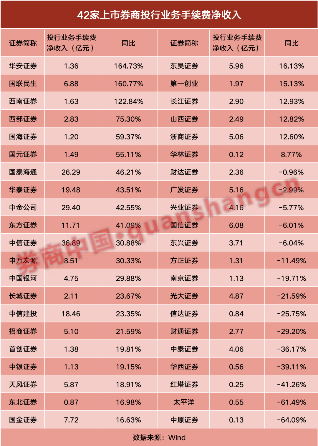 资管业务方面,从手续费净收入变化来看,上市券商表现则是收入下滑多过增长。42家有可比数据的上市券商中,仅有三成实现正增长,其中除大型券商外,长城证券、国金证券、东吴证券这几家中小券商表现亦不错,增幅均在10%以上。