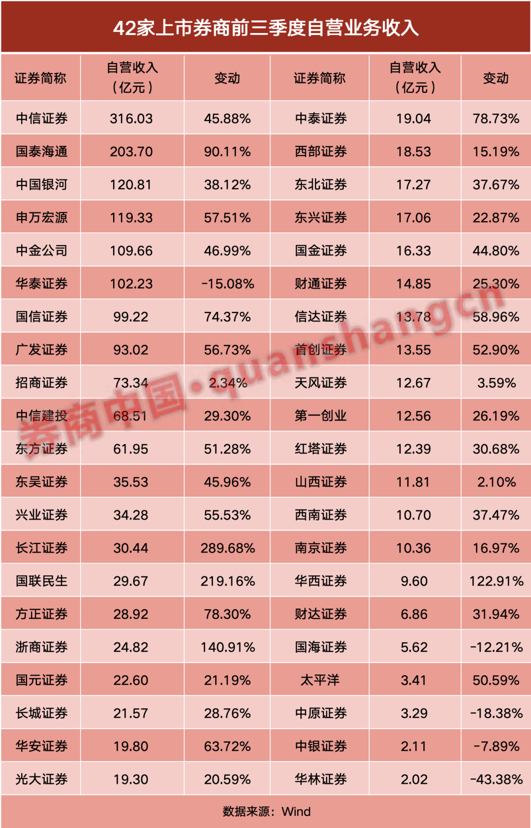 相比之下,有3家券商自营业务同比增幅不超过5%。中银证券、国海证券、华泰证券、中原证券、华林证券出现下滑。