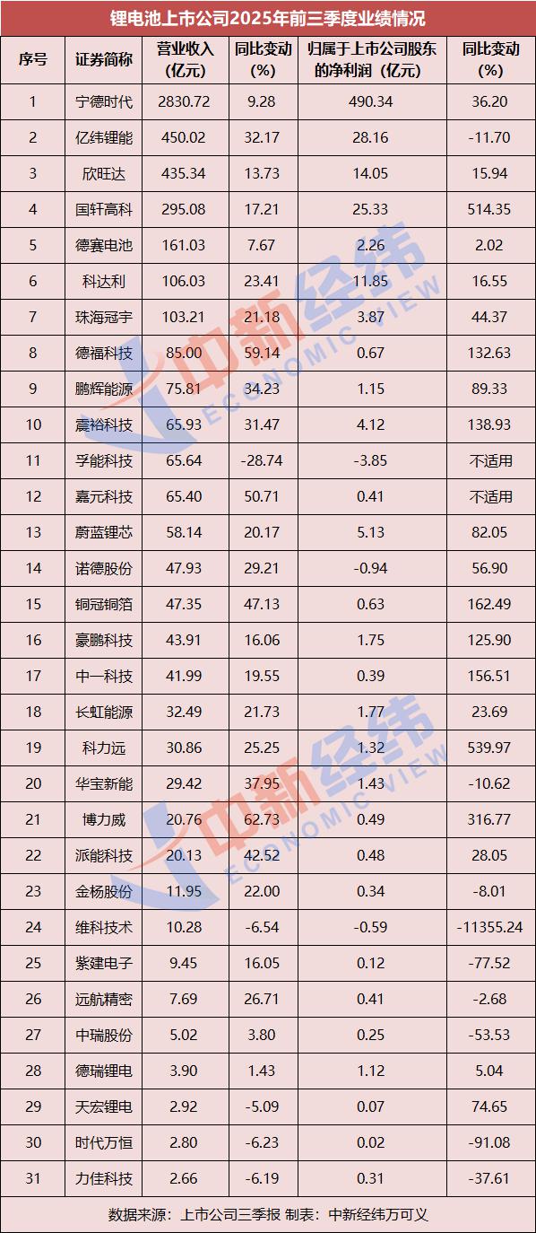 按照申万行业分类来看,A股锂电池板块共有31家上市公司。Wind数据显示,2025年前三季度,上述31家上市公司营收合计为5168.87亿元,同比增长14.24%;净利润合计为592.81亿元,同比增长39.23%。