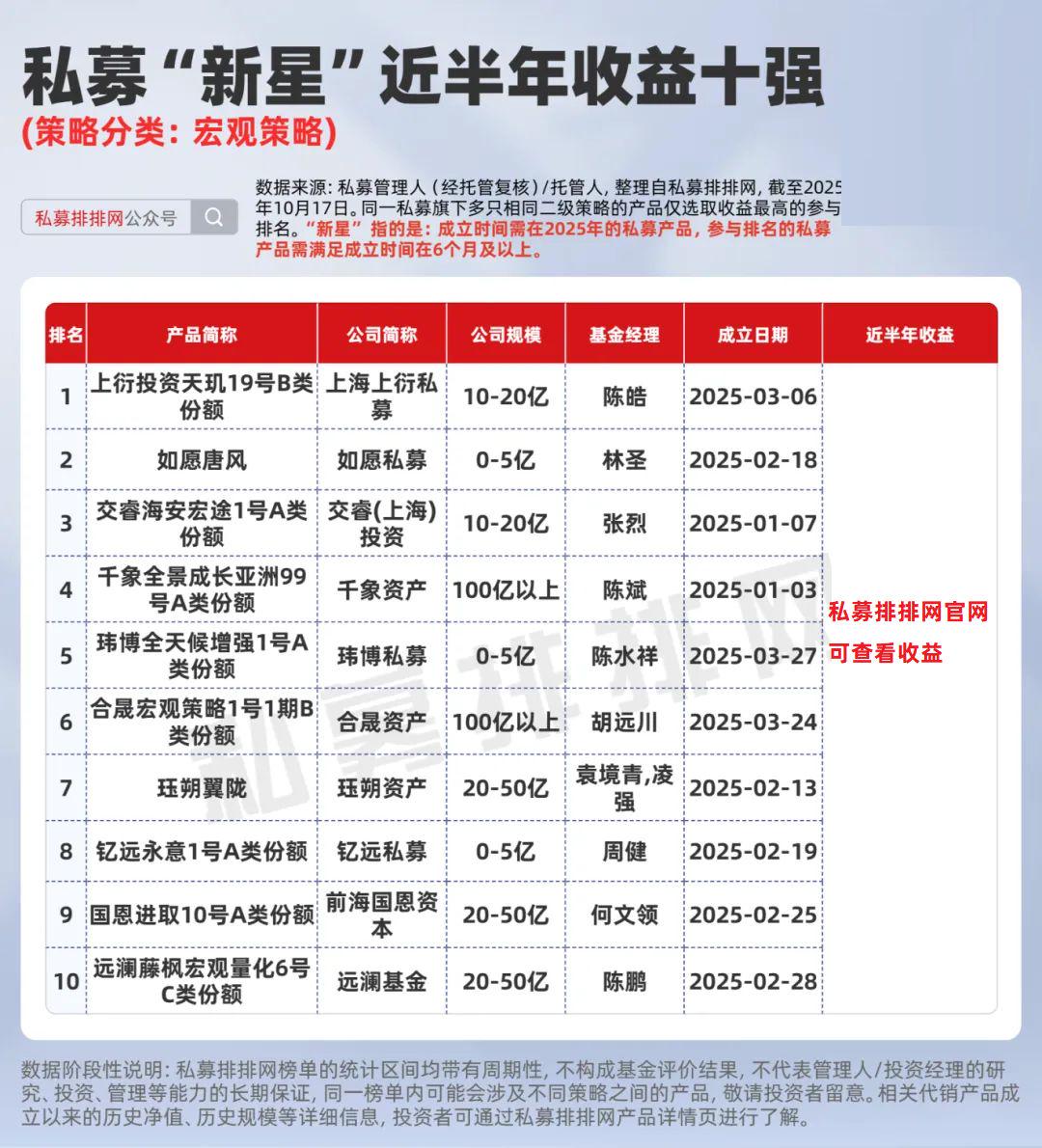 私募排排网数据显示,截至10月17日,符合排名规则的宏观“新星”产品共24只,近半年收益均值为13.03%,位居前三的产品分别来自:上海上衍私募、如愿私募、交睿(上海)投资。
