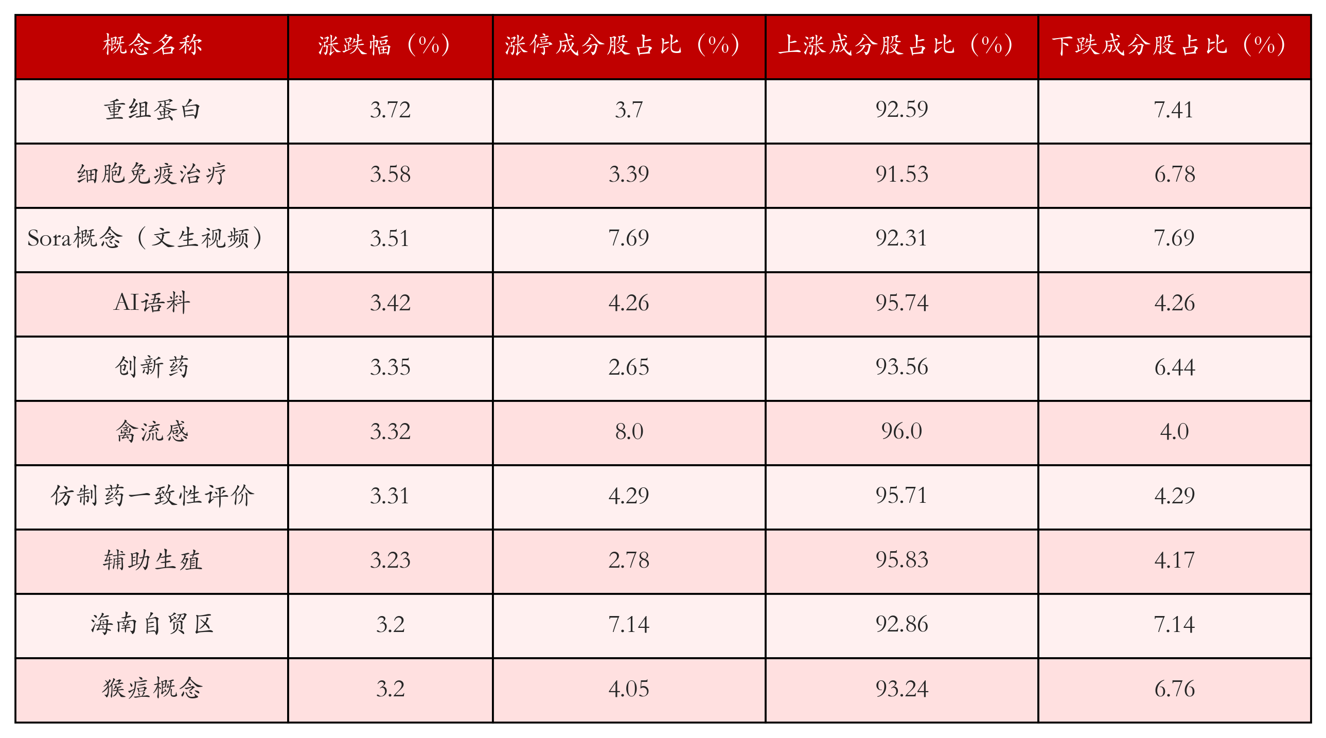 根据A股概念涨跌幅与所对应的股票池综合分析,涨幅靠前的三个概念板块分别为:重组蛋白、细胞免疫治疗与Sora概念(文生视频)。排名前10位的概念板块相关数据见下表: