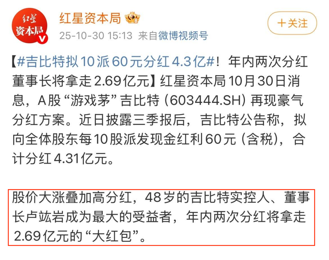 但树大招风,吉比特业绩恢复也刚不久,老板就对自己如此大方地分红,让各位投资人难免不满: