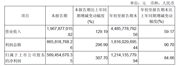 今年第三季度公司营收近19.7亿元,同比增长129 %;归母净利润约5.7亿元,同比暴增307.7%!