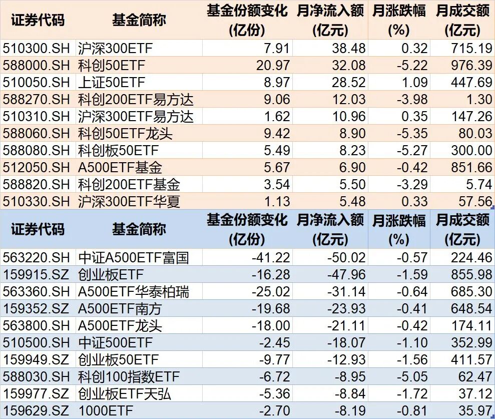 其中,沪深300ETF、科创50ETF在10月获得超30亿元资金净流入。