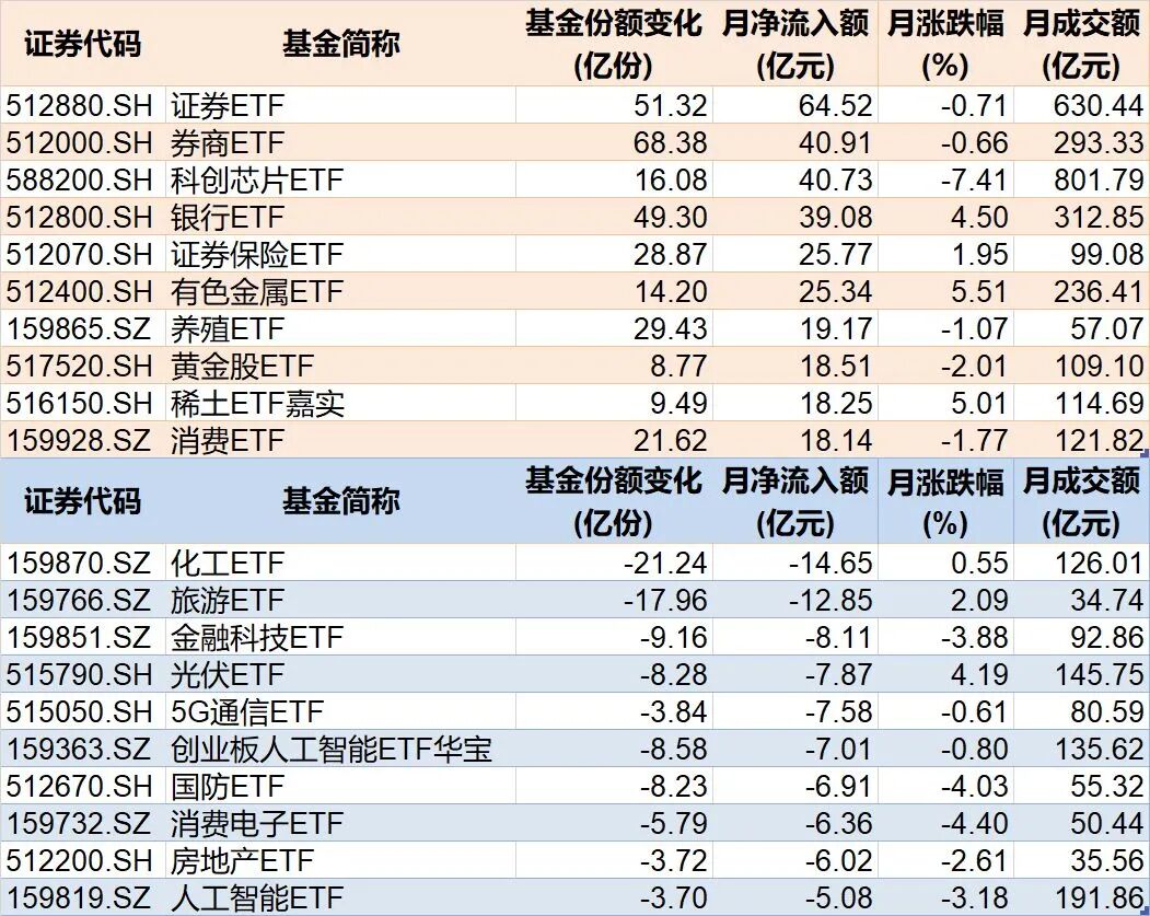行业主题上看,证券、科创芯片等相关ETF被资金看好,而化工、旅游相关ETF被资金抛售。