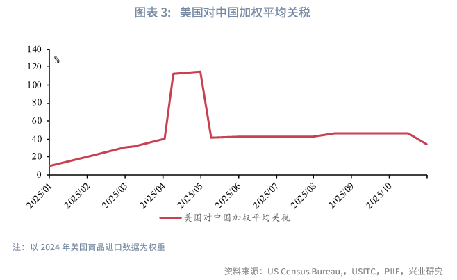 从当前美国对我国征收的关税水平来看,基于PIIE的数据,在“芬太尼关税”下降后美,美国对我国征收的平均关税水平或降至47.6%。美国对我国征收的关税水平较全球其他地区的差值便缩小至28.1%。在特朗普第二次上台前,美国对我国加征的关税较世界其他地区的差值为17.8%。考虑部分商品豁免、出口权重变动等因素后,实际加权税率约在35%左右。