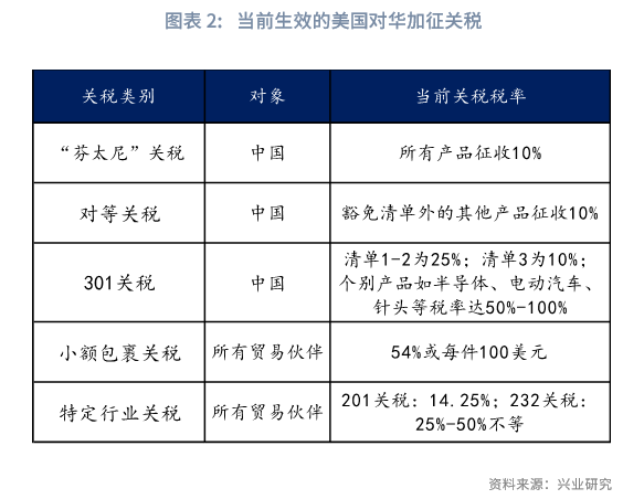 当前美国对中国生效的加征关税主要包括以下几个部分:大约20%的301关税、10%的“芬太尼关税”、10%的“对等关税”、201(光伏)和232(钢铝、汽车及零部件、铜制品等)关税、小额包裹54%或每件100美元关税。
