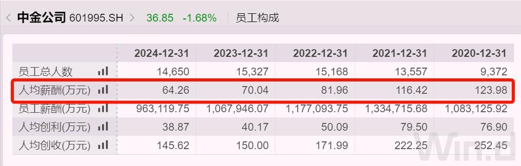 至于员工,薪酬也同步下调。2020年,中金公司人均税前薪酬大约124万元,2024年还剩下64万元,大约为当时的一半,比2023年减少6万元。即便如此,在上市券商中,中金的人均薪酬依旧高居第四。