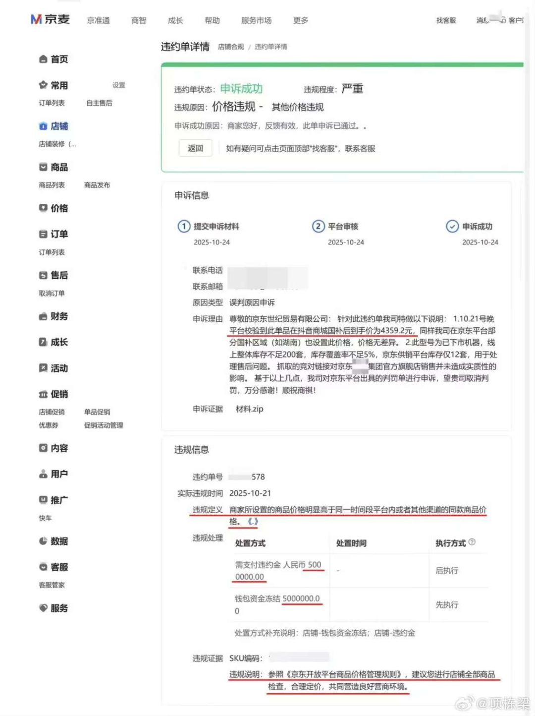 之后,该事件又有了反转,综合各方信息特别是一张后台截图看,京东确实曾对美的开出过罚款,只不过事件发酵后,美的通过后台申诉成功,京东又取消了罚单。