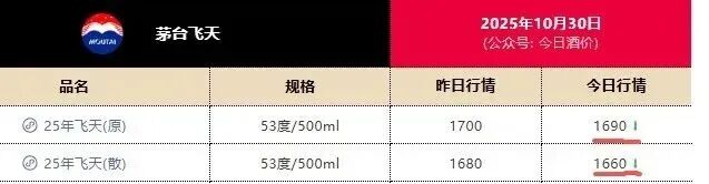 除了业绩增速放缓,茅台酒的价格体系也面临严峻考验。根据第三方平台“今日酒价”显示,截至10月30日,25年飞天茅台原装和散装的批发参考价均已跌破1700元关口,其中原装降至1690元/瓶,散装降至1660元/瓶。