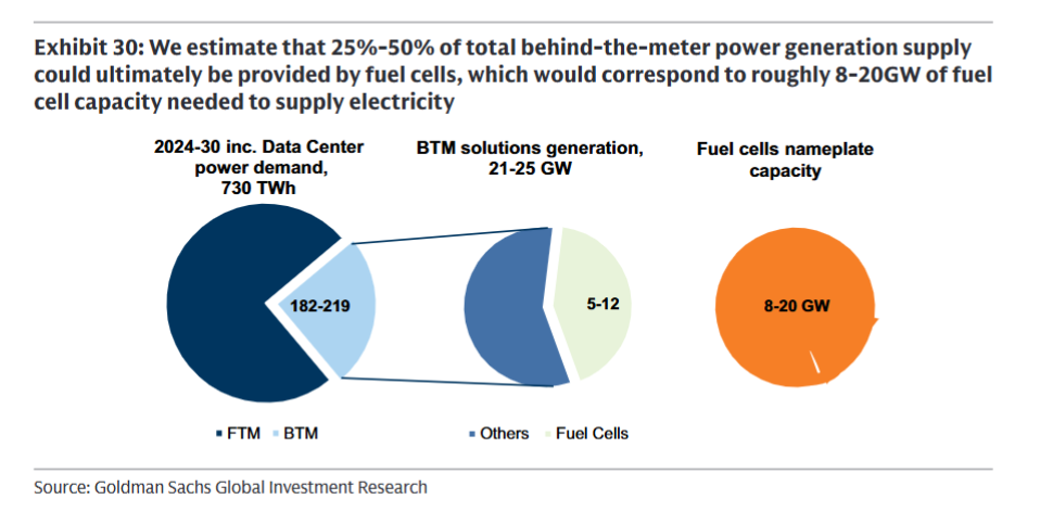 综合以上优势,高盛对燃料电池在数据中心市场的应用前景极为乐观。报告的核心预测是,到2030年,燃料电池将占据BTM解决方案市场25%至50%的份额,相当于8-20吉瓦(GW)的装机容量。