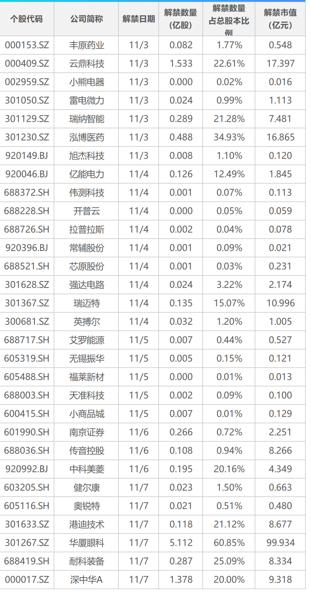 Wind数据显示,本周,限售股上市数量为10.28亿股,市值约为203.22亿元。华厦眼科是本周解禁市值最大的一家公司,将有5.11亿股限售股在11月7日到期,占总股本比例为60.85%,市值约为99.93亿元。