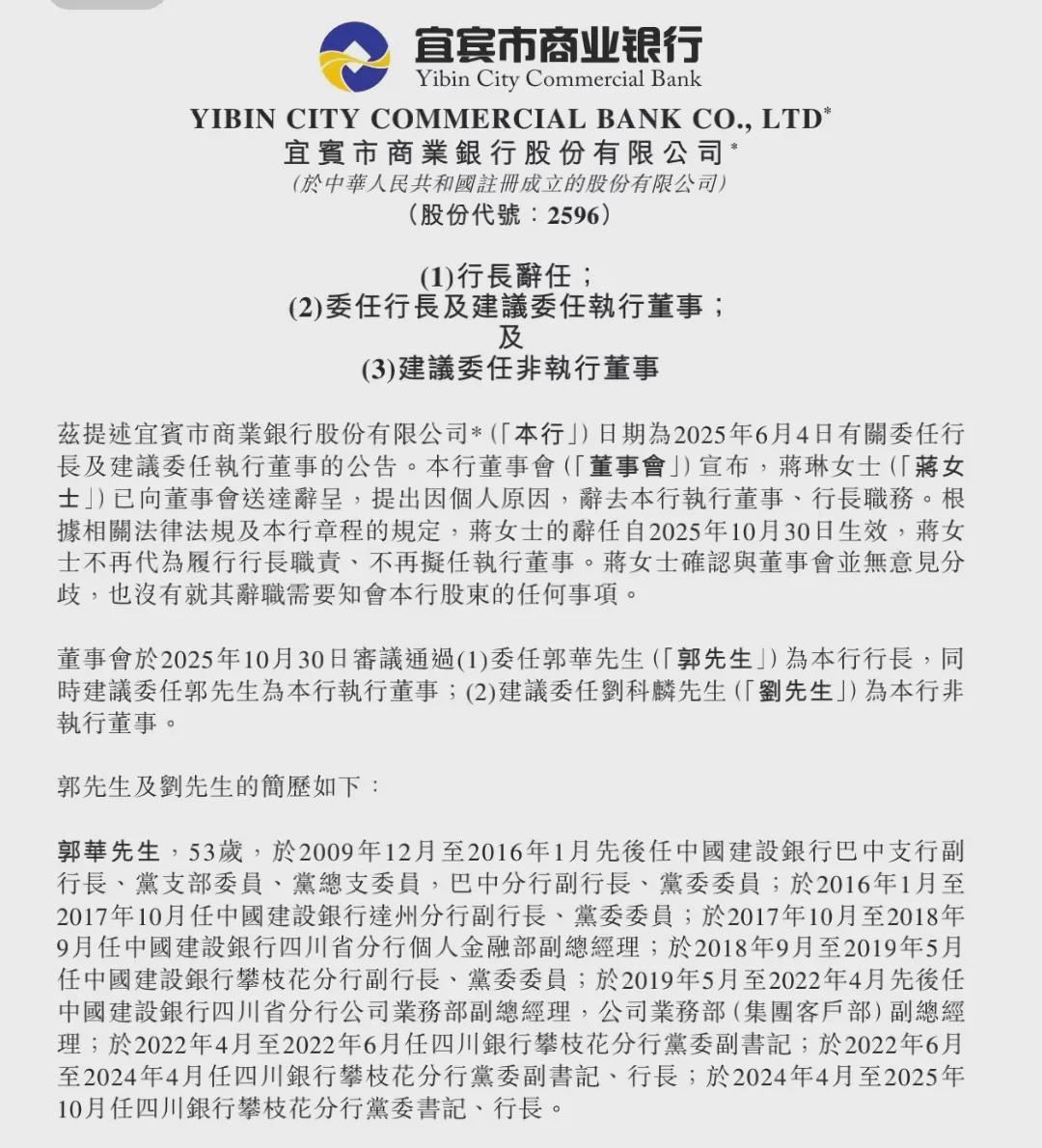 10月底,宜宾银行突然宣布蒋琳因个人原因辞去执行董事、行长,该职务由新选聘的郭华接任。
