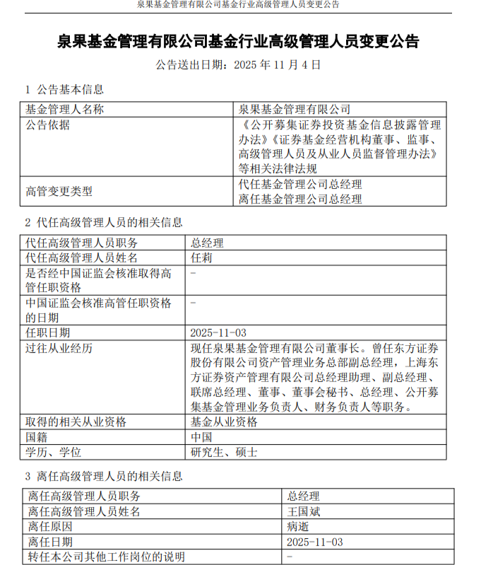 11月3日,泉果基金发布高级管理人变更公告,总经理王国斌因病逝世,公司董事长任莉代任总经理。