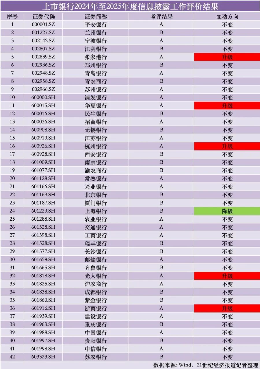 21世纪经济报道记者对沪深交易所披露的上市银行2024至2025年度信息披露工作评价结果进行了整理,发现42家A股上市银行的信披评级均在B以上,其中22家上市银行的信息披露评价为A。上市银行的评级普遍与上年保持一致,仅6家出现变动,其中光大银行、华夏银行、浙商银行、杭州银行和张家港行的考评等级上升,仅上海银行1家下降。