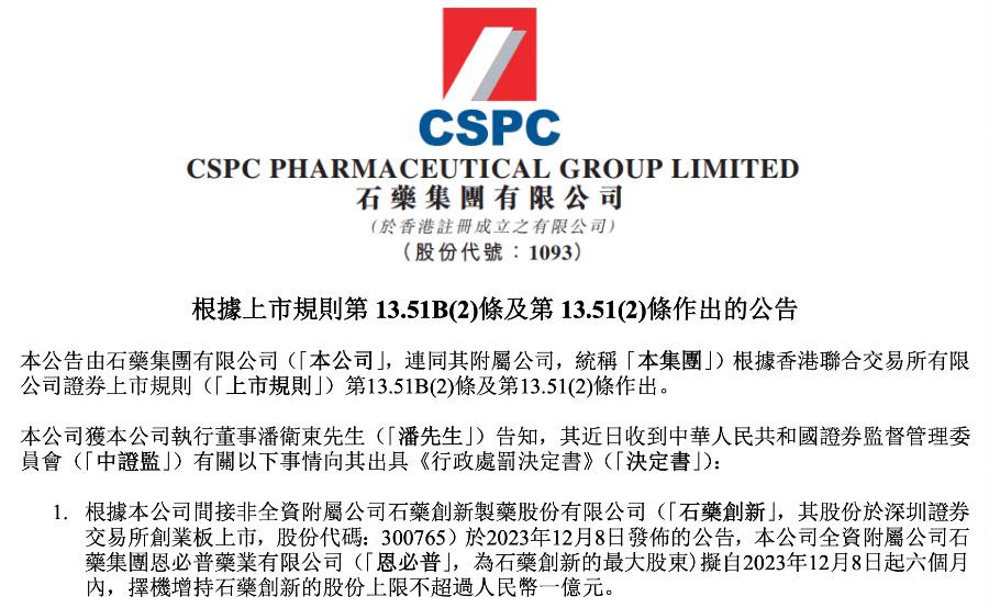 11月3日,石药集团公告称,公司获执行董事潘卫东告知,其近日收到中国证券监督管理委员会(简称“证监会”)出具的《行政处罚决定书》,因内幕交易被罚500万元。