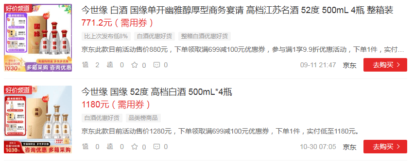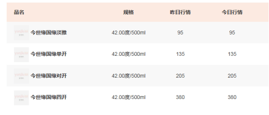然而,今年主力单品动销乏力。业内专注提供名酒价格行情的“今日酒价”网显示,今世缘国缘四开价格为380元/瓶,不足400元;“什么值得买”也显示,国缘系列产品折单瓶价格在400元以下。