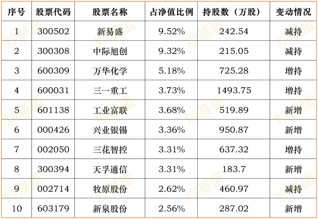 前十持仓股占比33.64%→46.59%,3季度涨53.21%。新增工业富联、兴业银锡、天孚通信、新泉股份,其他各有增减。持股集中度不高,但出现了“易中天”,业绩亮眼。
