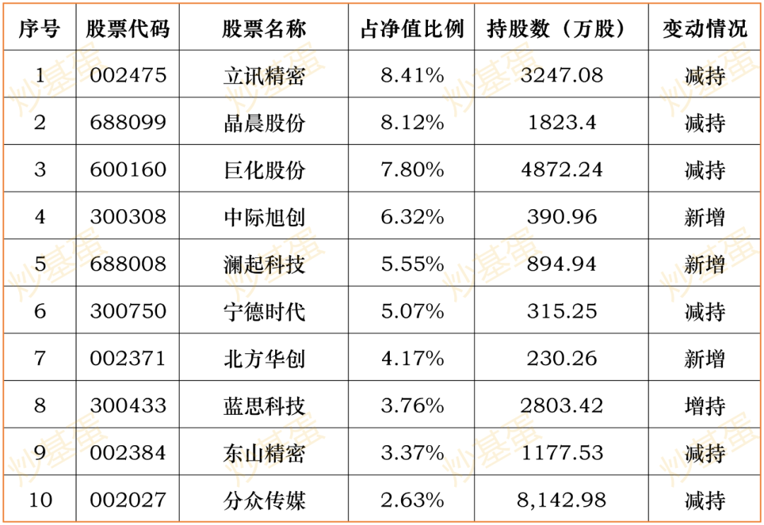 这次找了主动权益基金排名靠前的,主要是管理规模超过300亿的,共计有8位基金经理。通过最新季报里的前十大持仓,观察一下他们的调仓动向。