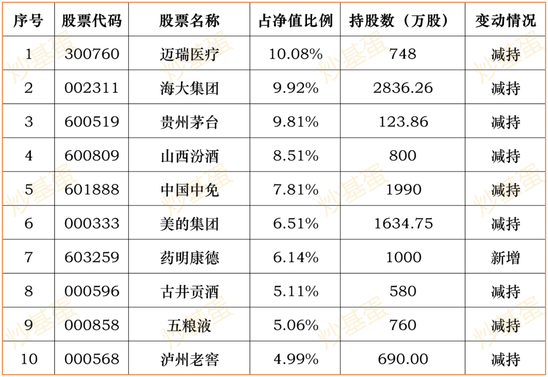 前十持仓股占比76.75%→73.94%,3季度涨9.09%。新增药明康德,其他均有所减持。与张坤一样,也是几年前消费行情走牛积攒的规模,目前看还在这个圈内,继续坚守白酒等传统消费板块。