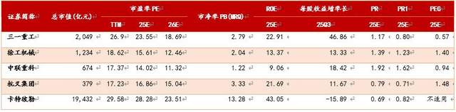若用PEG来衡量,剔除增长率为负的公司,可比公司PEG介于0.57至1.48之间,三一重工受益于25年前三季度每股收益增长率46.86%,PEG为0.57倍,核心关注修复的斜率。