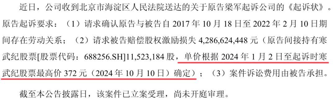 这起劳动总裁的诉讼金额42.87亿,则是根据寒武纪2024年1月2日至起诉时股票最高价372元计算得出。