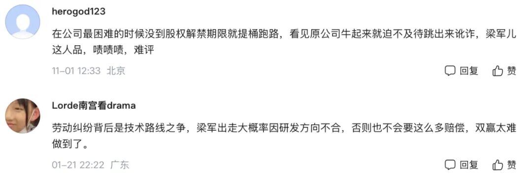 有批评梁军的声音称,他在公司最困难时没到股权解禁期限就提桶跑路,现在又回头起诉公司。