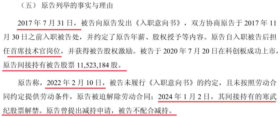 寒武纪被前员工梁军起诉,索赔股权激励损失高达42.87亿,对应股票数1153万股。