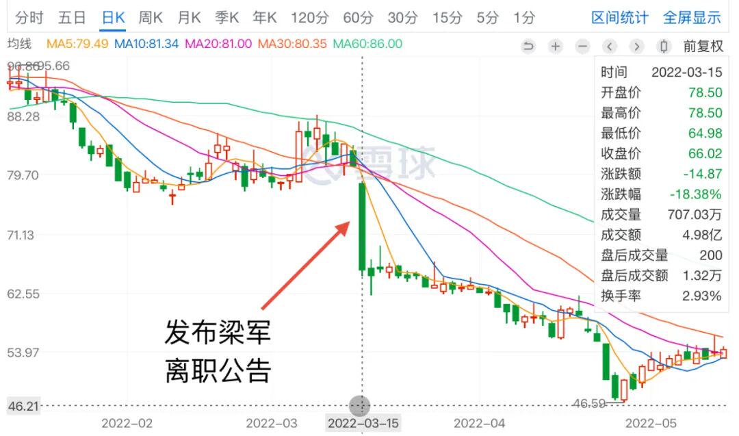 最终于2020年3月15日,寒武纪发布梁军离职公告,当天造成公司股价直接崩了,大跌18%收盘,市值蒸发近60亿。