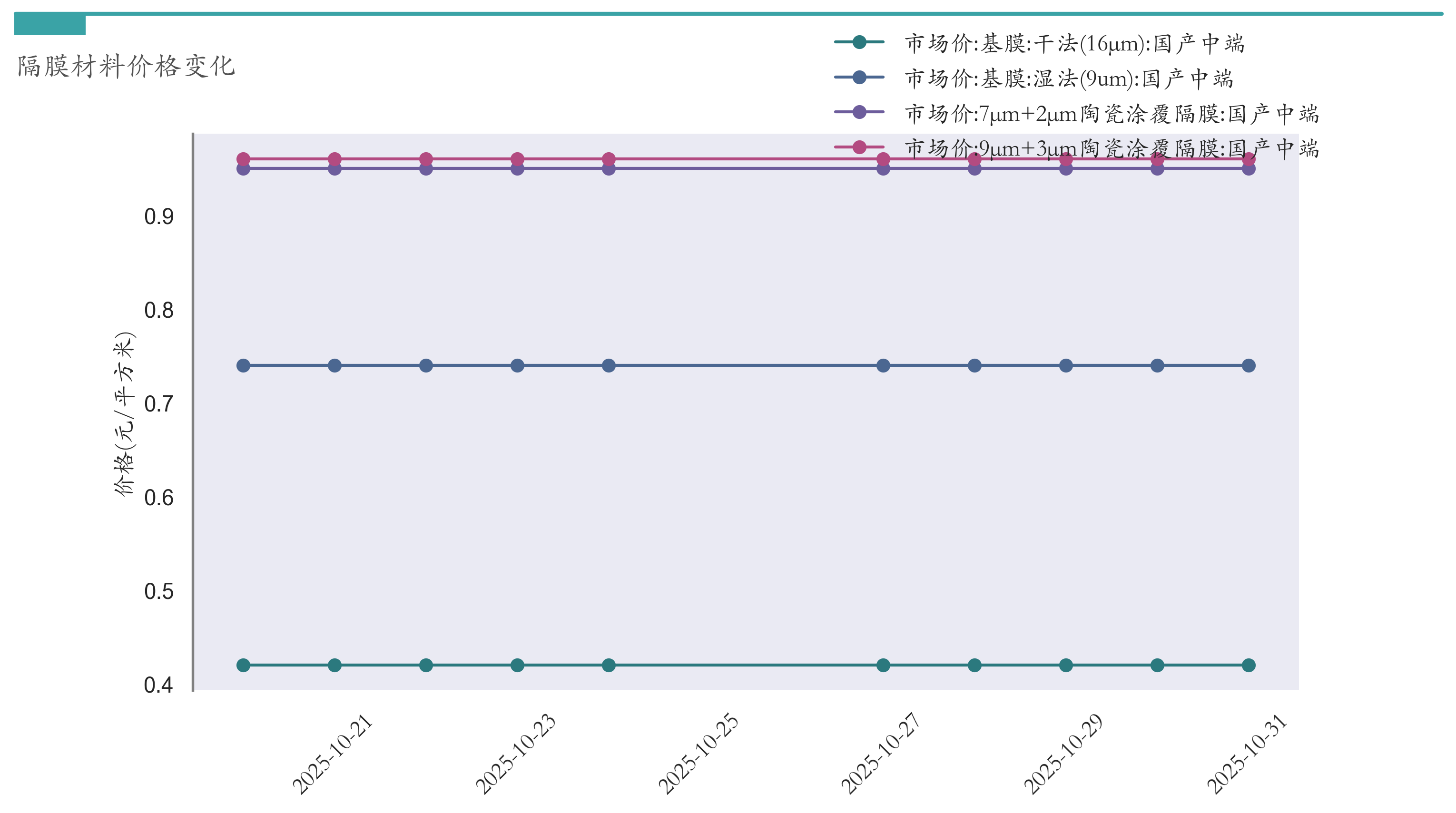 截至10月31日,干法16μm基膜市场报价为0.42元/平方米,较10月24日持平。湿法9um基膜市场报价为0.74元/平方米,较10月24日持平。7μm+2μm陶瓷涂覆隔膜市场报价为0.95元/平方米,较10月24日持平。9μm+3μm陶瓷涂覆隔膜市场报价为0.96元/平方米,较10月24日持平。近两周隔膜材料价格变化如下图所示: