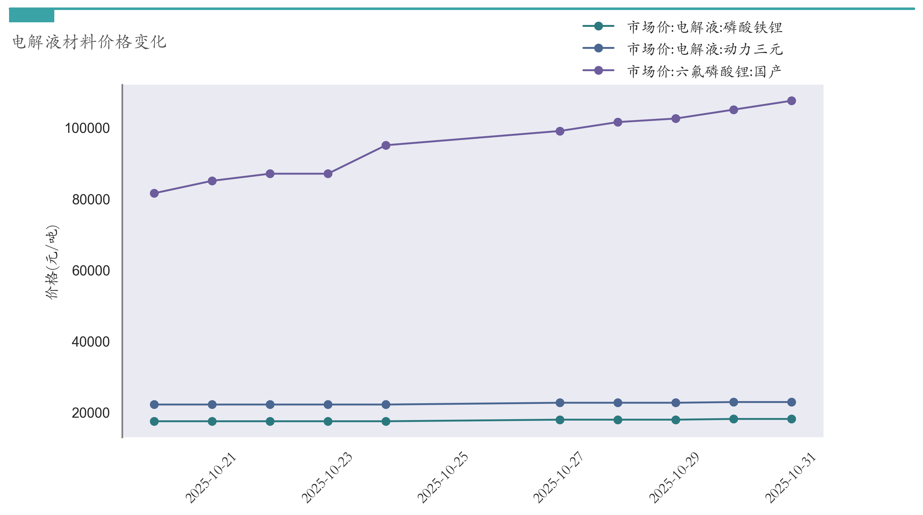 截至10月31日,六氟磷酸锂市场报价为107500元/吨,较10月24日上涨12500元/吨。电解液(磷酸铁锂)市场报价为18100元/吨,较10月24日上涨650元/吨。电解液(动力三元)市场报价为22850元/吨,较10月24日上涨700元/吨。近两周电解液材料价格变化如下图所示:
