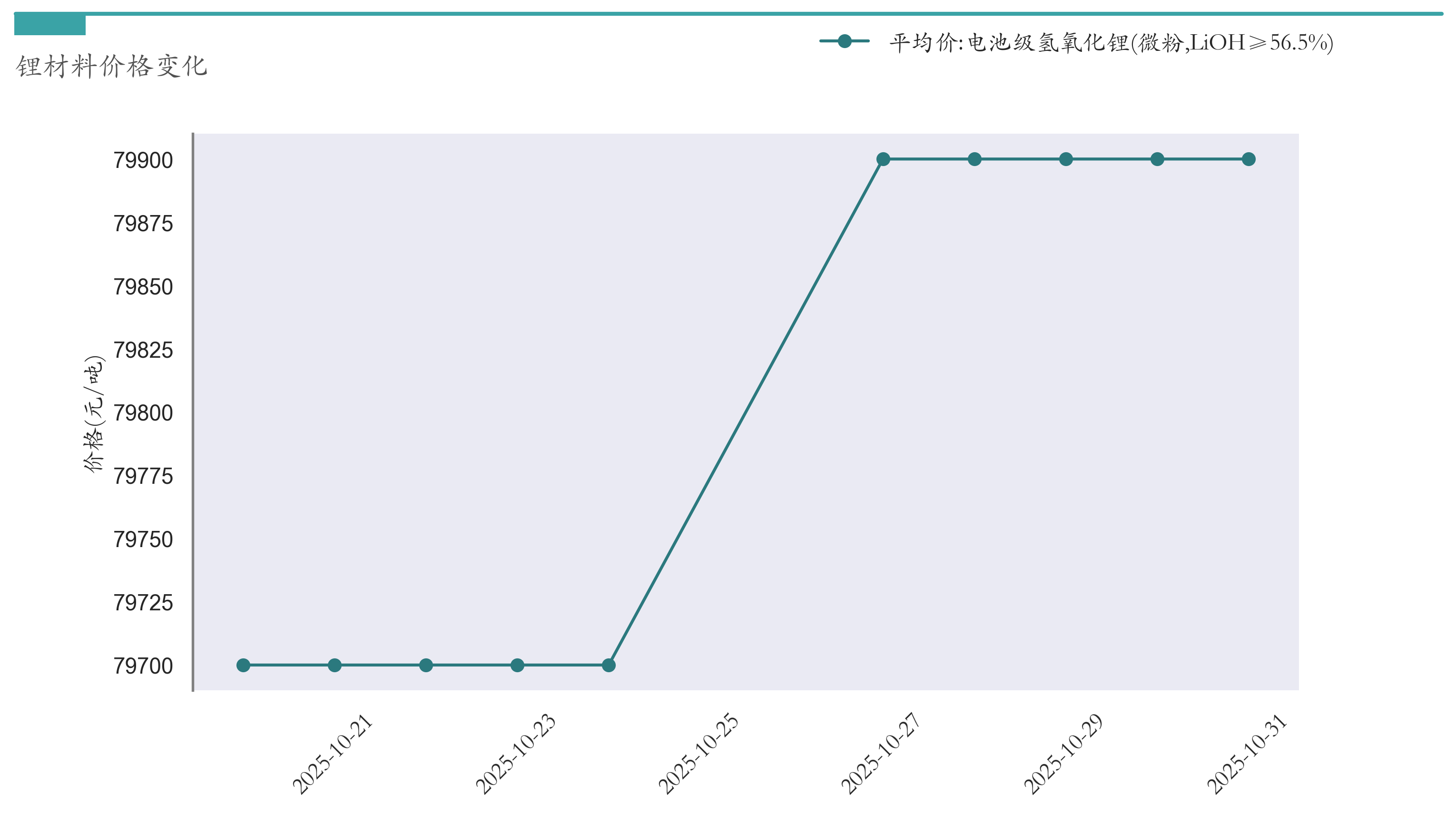 截至10月31日,电池级氢氧化锂平均报价为79900元/吨,较10月24日上涨200元/吨。近两周氢氧化锂价格变化如下图所示: