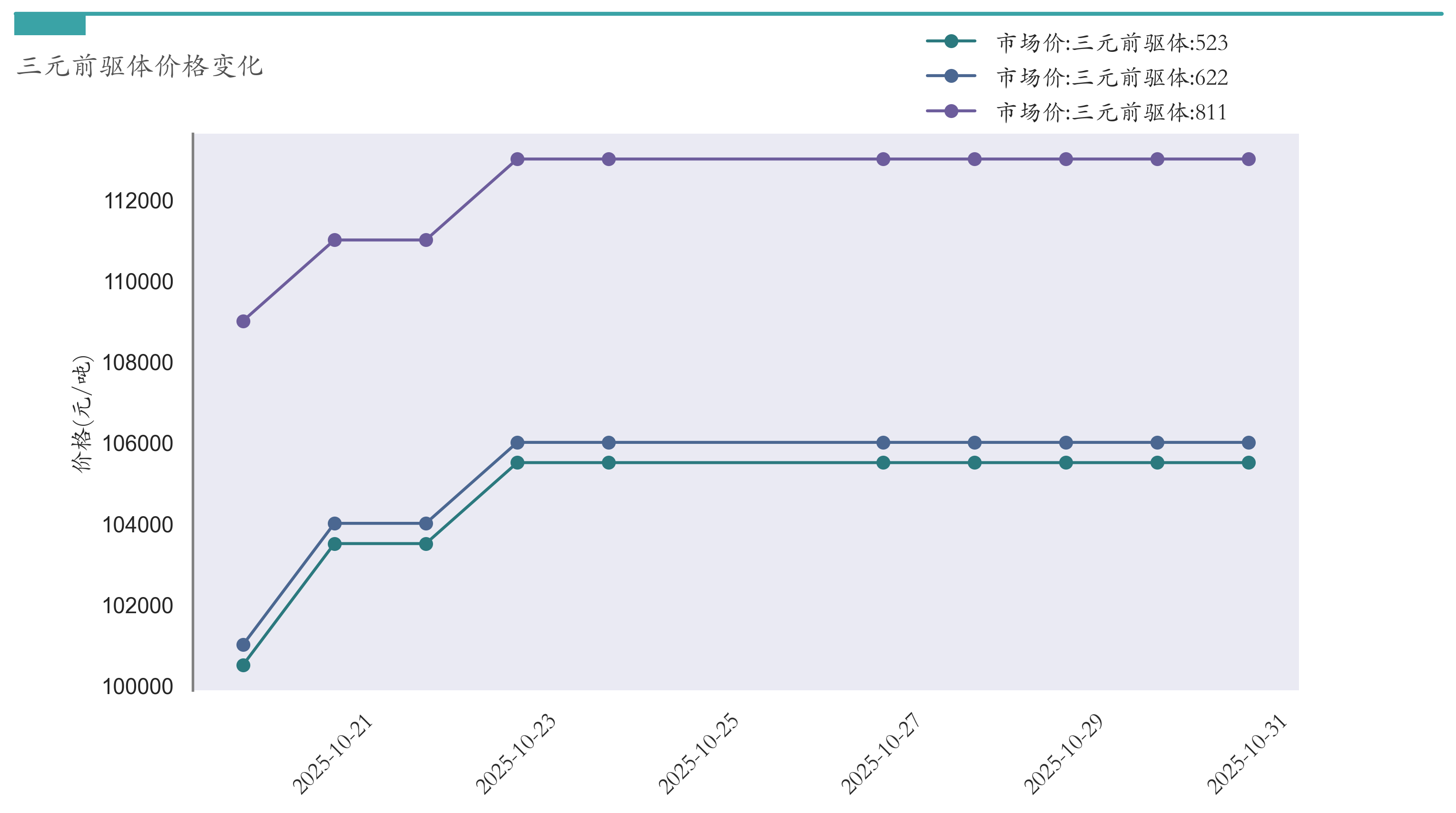 截至10月31日,三元前驱体811市场报价为113000元/吨,较10月24日持平。三元前驱体622市场报价为106000元/吨,较10月24日持平。三元前驱体523市场报价为105500元/吨,较10月24日持平。近两周三元前驱体价格变化如下图所示: