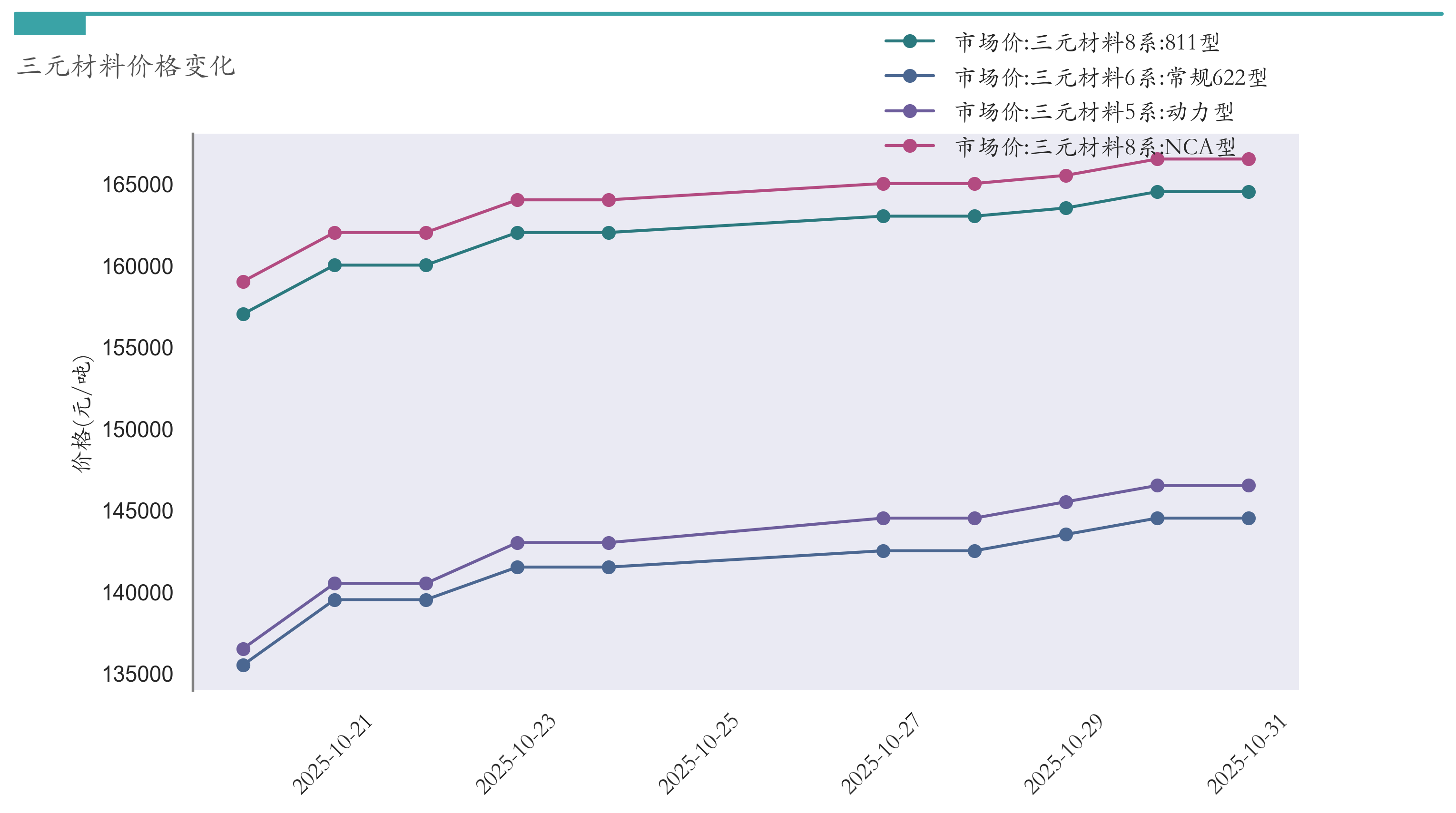 截至10月31日,三元材料8系:811型市场报价为164500元/吨,较10月24日上涨2500元/吨。三元材料8系:NCA型市场报价为166500元/吨,较10月24日上涨2500元/吨。三元材料6系:常规622型市场报价为144500元/吨,较10月24日上涨3000元/吨。三元材料5系:动力型市场报价为146500元/吨,较10月24日上涨3500元/吨。近两周三元材料价格变化如下图所示: