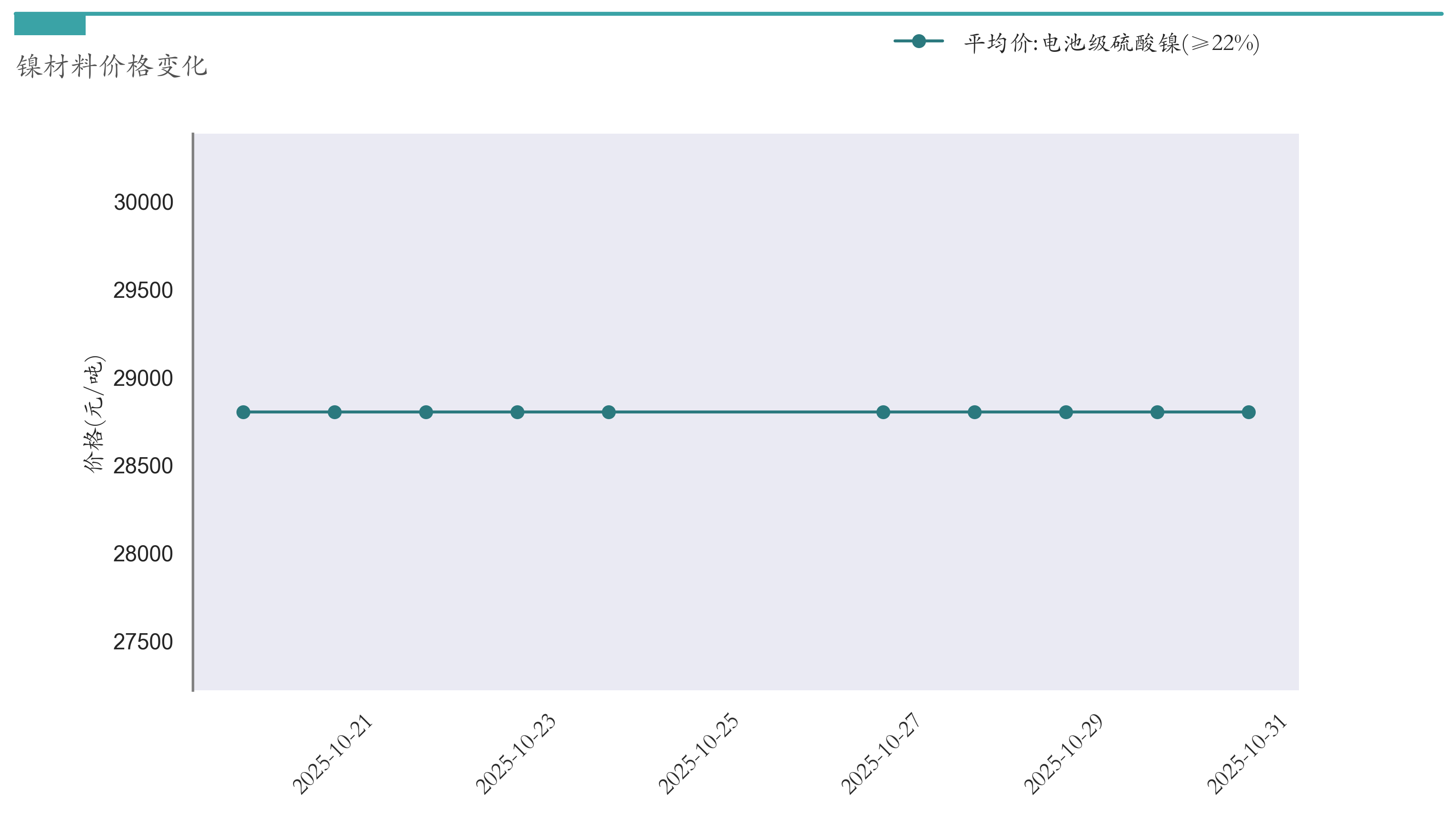 截至10月31日,电池级硫酸镍平均报价为28800元/吨,较10月24日持平。近两周镍材料价格变化如下图所示: