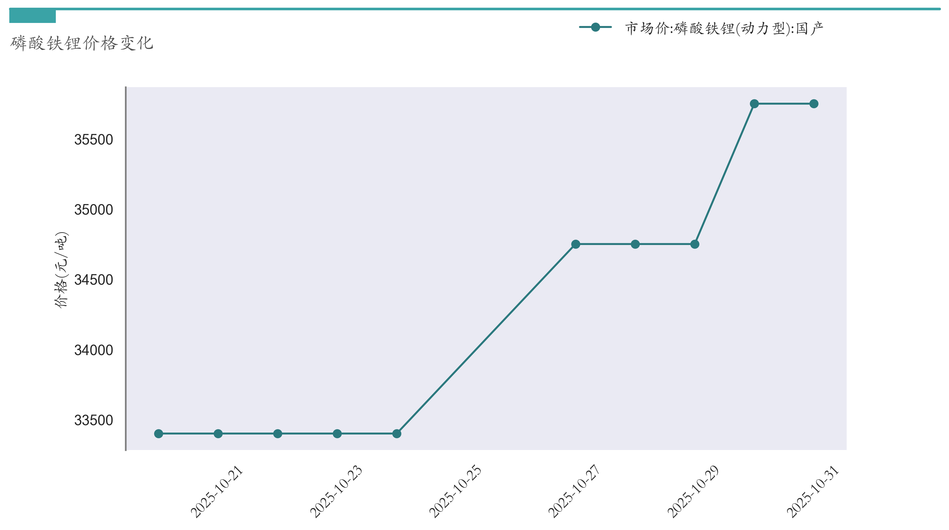 截至10月31日,磷酸铁锂市场报价为35750元/吨,较10月24日上涨2350元/吨。近两周磷酸铁锂价格变化如下图所示: