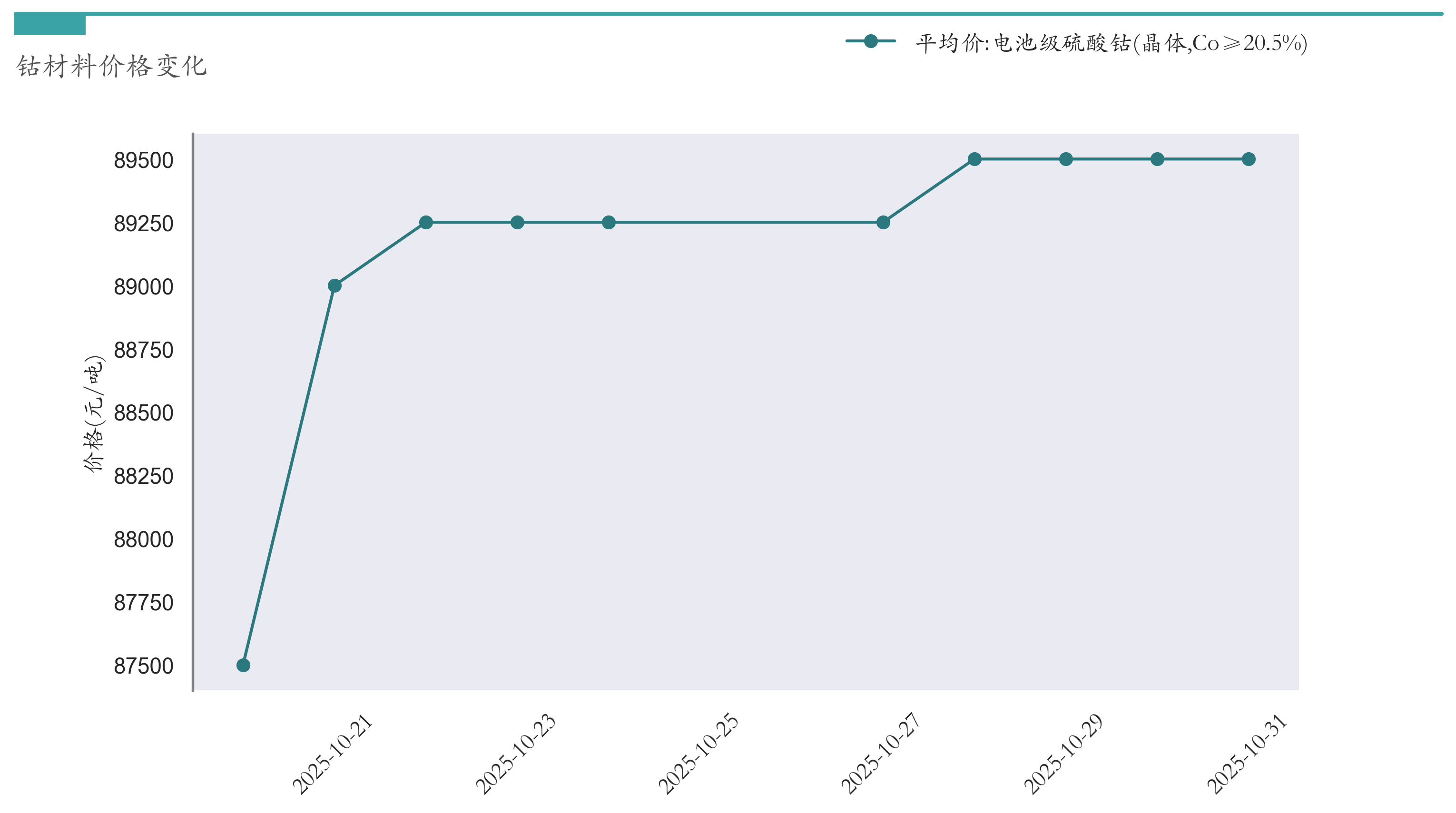 截至10月31日,电池级硫酸钴平均报价为89500元/吨,较10月24日上涨250元/吨。近两周钴材料价格变化如下图所示:
