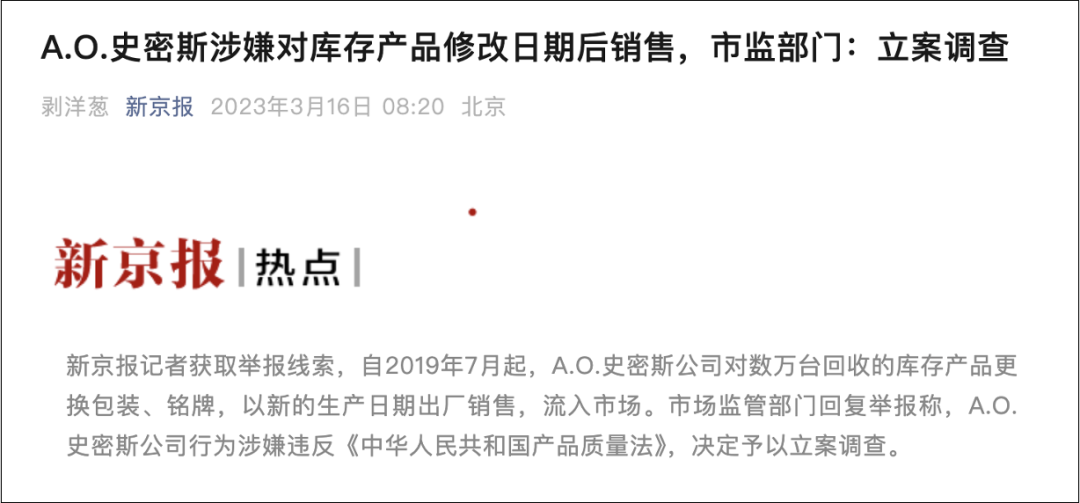 2023年新京报就曾报道,A.O.史密斯公司对回收的数万台库存产品更换包装、铭牌后,以新日期出厂销售,且未向消费者披露实情,这也是家电行业的普遍做法。