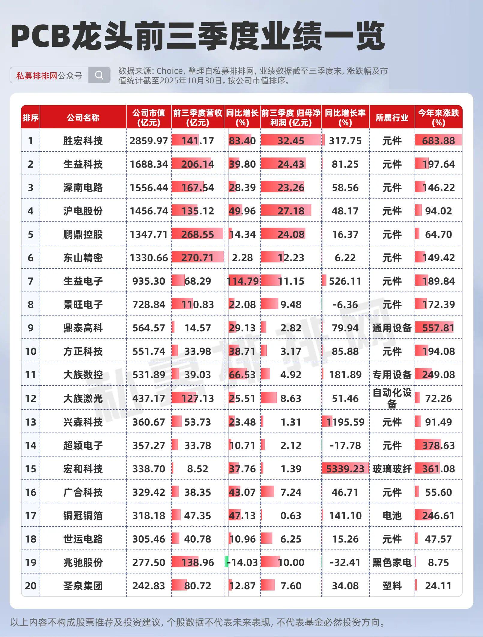 股价表现上来看,A股PCB前二十大市值龙头中,今年来涨幅在100%以上高达12只个股,今年来涨幅均值为199.26%。业绩方面来看,胜宏科技、生益科技、生益电子等头部厂商在2025年前三季度业绩普遍实现高速增长。