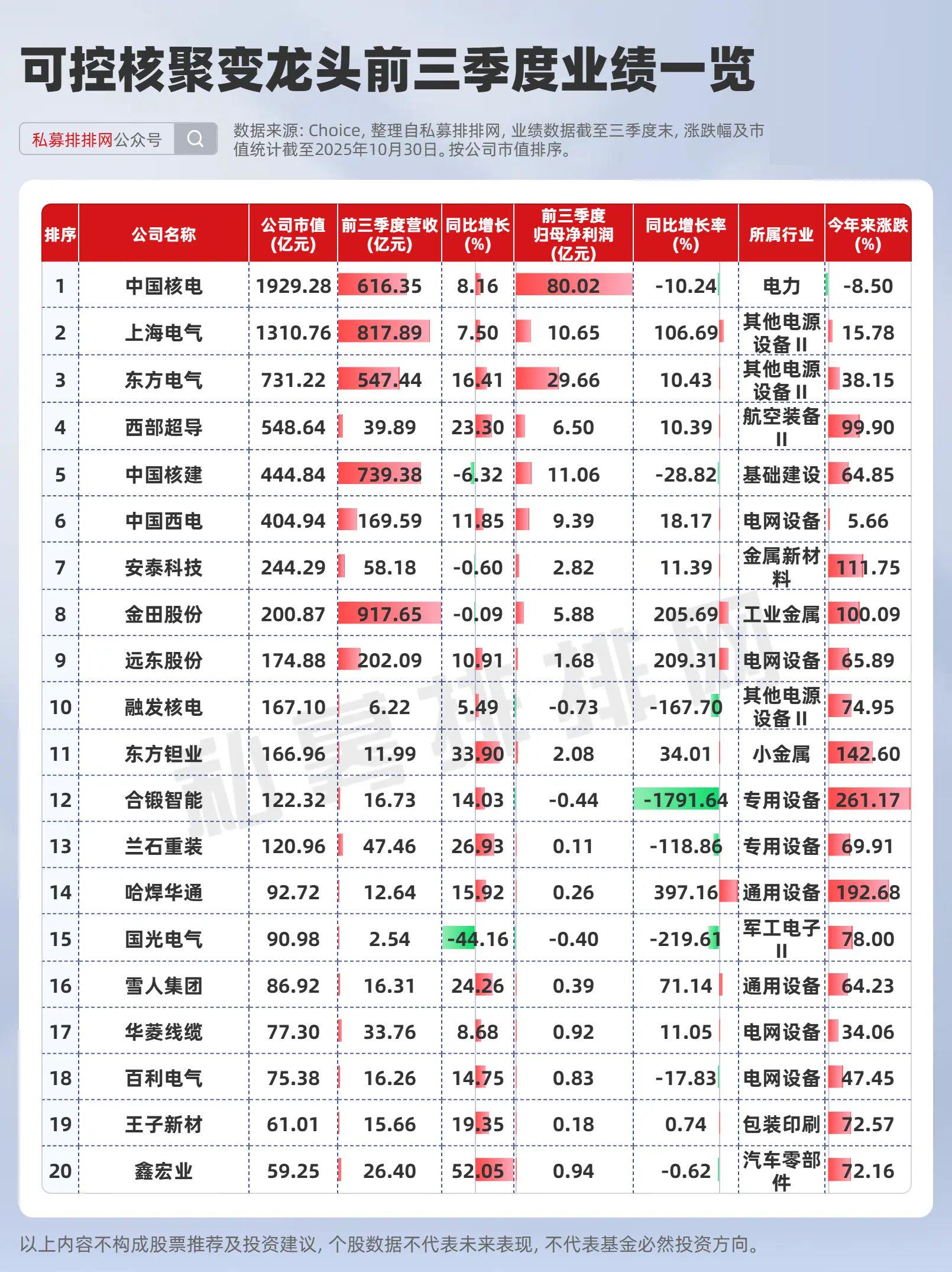 股价表现上来看,A股可控核聚变前二十大市值龙头中,今年来涨幅在100%以上有5只个股,今年来涨幅均值为80.17%。业绩方面来看,上海电气、金田股份、远东股份、哈焊华通等在2025年前三季度业绩普遍实现高速增长。