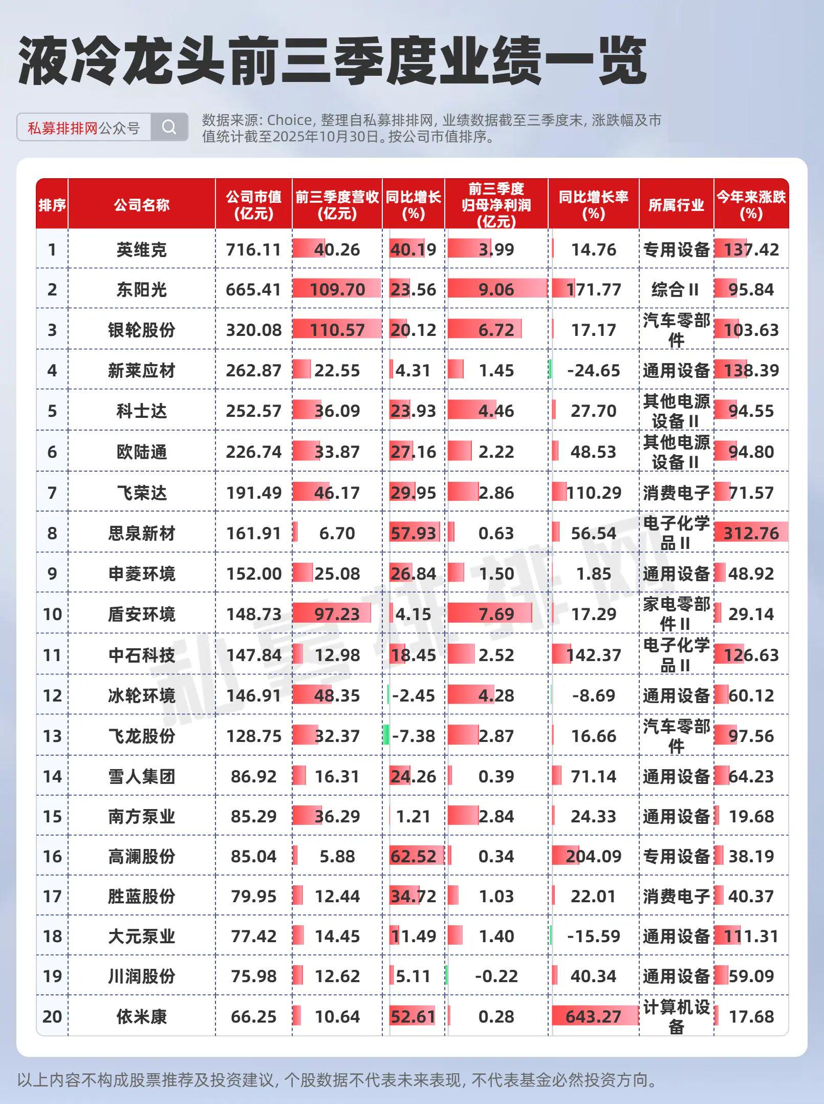 股价表现上来看,A股液冷前二十大市值龙头今年来涨幅均值为88.09%,今年来涨幅在100%以上有6只个股。业绩方面来看,英维克、银轮股份、飞荣达等头部厂商在2025年前三季度业绩增速表现较为领先。