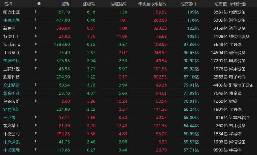 市场亏钱效应明显,共计1630只个股收涨,涨停股67只;3650只个股收跌,跌停股8只。就日成交额靠前的个股来看,仅有4只个股日成交额超过100亿元,阳光电源跌幅超过6%,宁德时代跌逾2%;中际旭创微跌、新易盛微涨;特变电工涨近2%,包钢股份涨近5%。