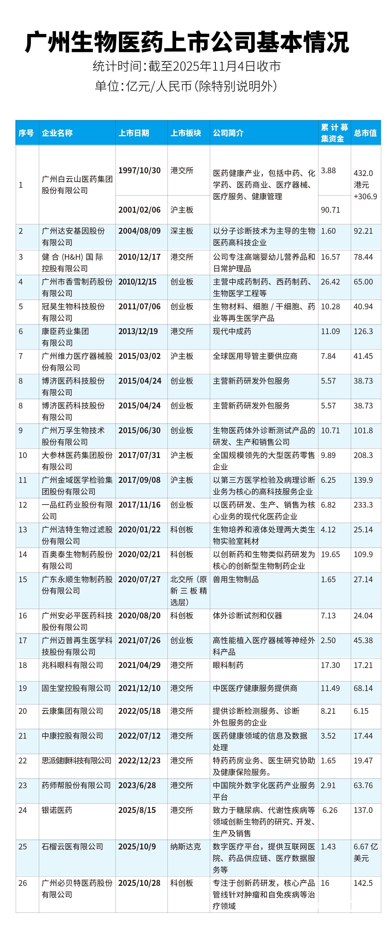 截至南都发稿前止,广州生物医药上市企业已达26家,形成从化学药、生物药到医疗器械、数字医疗,从检测、研发外包到大型流通等服务在内的完整产业矩阵,共募集资金逾300亿元人民币。截至11月4日16时止,这26家企业总市值接近3000亿元。