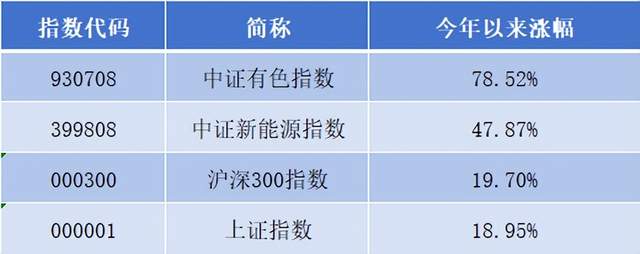 回来到资本市场,今年以来有色金属指数、新能源指数涨势喜人,领跑主要宽基指数,涨幅分别为78.52%、47.87%。