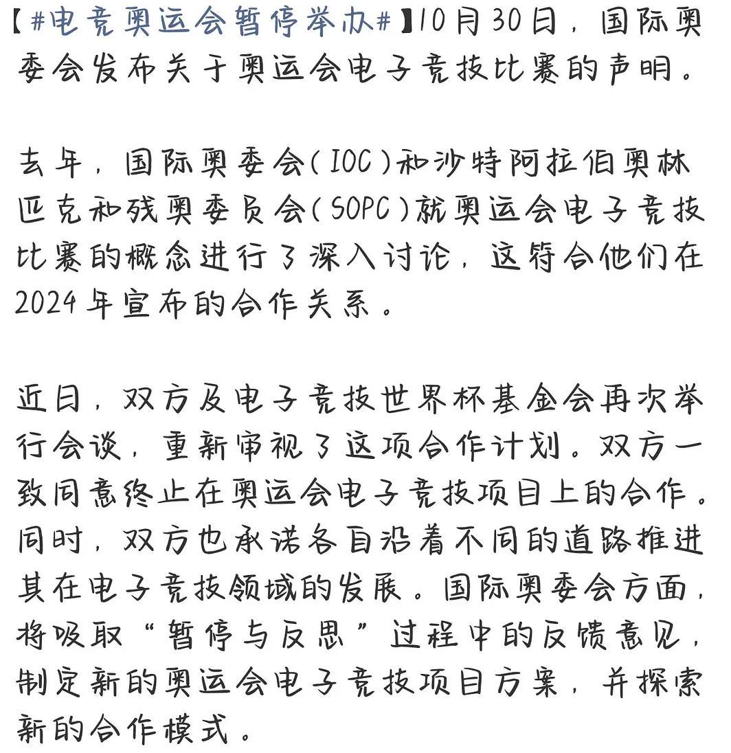 10月30日,国际奥委会宣布,经过双方的讨论和对合作计划的再度审视,决定向沙特“撤回”一个奥运会,并将吸取“暂停与反思”中的意见,制定新的电子竞技奥运会方案,探寻新的合作模式。