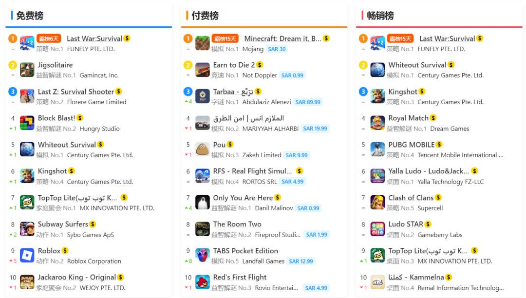 实时查阅11月3日的沙特APP STORE榜单,中国公司出品的游戏表现格外突出。