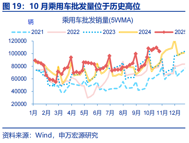 PPI:虽然中下游产能利用率持续偏低,但10月以来上游大宗明显涨价,或推动PPI温和恢复。大宗价格方面,虽然钢价出现较大幅度回落(环比-1.4%),但国内铜价、煤价延续上涨(环比分别7.5%、5.5%),同时国际油价领先我国PPI半个月,9月中旬-10月中旬油价环比降幅收窄至-0.2%,预计大宗价格对PPI贡献仍在持续。但反内卷落地滞后下,中下游产能过剩问题仍较明显,令中下游价格修复斜率偏慢,因而10月PPI修复程度有限、预计可能回升至-2.1%左右。