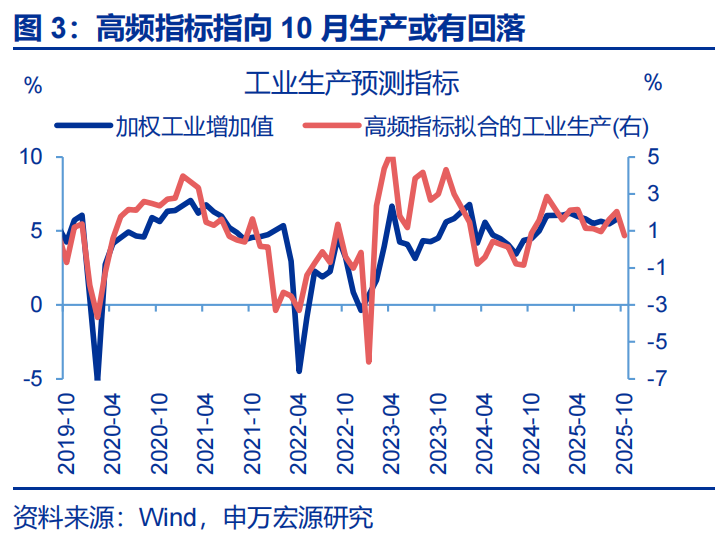 总结:政策已在积极对冲经济的内生压力下,数据拟合后的10月实际GDP或为4.6%、仍保持较高增速。10月以来,“高库存”等短期因素的扰动,或令供给侧对经济景气的约束较大;同时企业加快清偿欠款等影响下,需求侧也面临一定程度的下行风险。但目前政策已在积极落地,近期中央财政从地方政府债务结存限额中安排5000亿元下达地方,政策性金融工具加快落地,化债对投资的挤出效应或趋弱;同时中美关税政策缓和,出口或仍保持高景气,预计短期内经济修复或迎来拐点。生产法下,通过数据拟合来看,10月GDP实际同比或在4.6%左右。